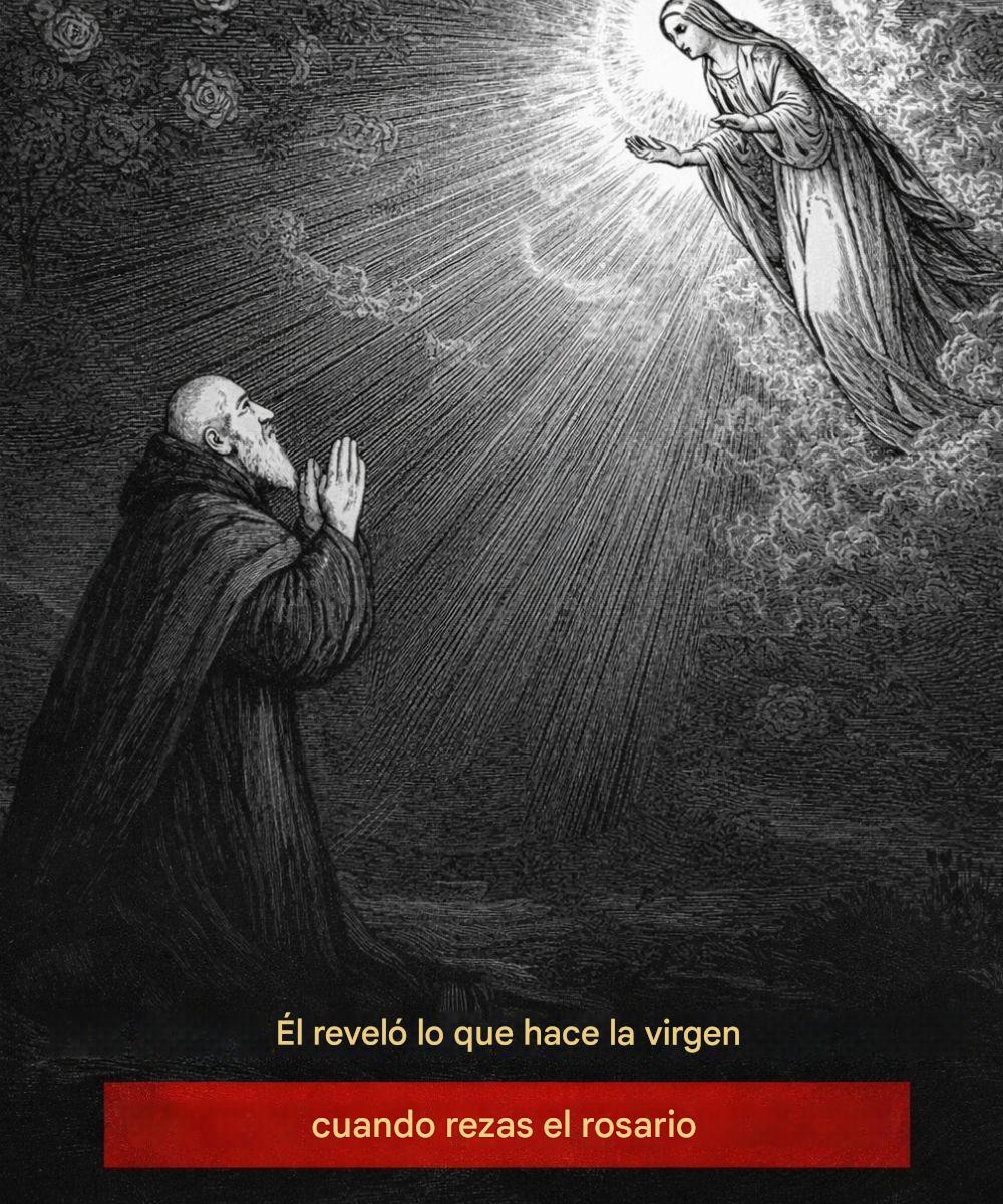 Mientras sus dedos recorrían un rosario desgastado por años de devoción, su celda se llenó de una luz suave y una fragancia que más tarde describió como única en la tierra. En esa atmósfera sagrada, la Virgen María se apareció, no para asombrarlo, sino para enseñarle.