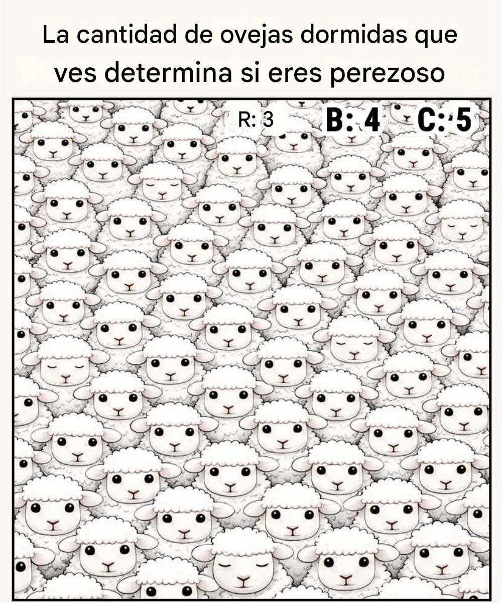 A primera vista, la imagen parece simple: un campo lleno de adorables ovejas de dibujos animados. Pero escondidas entre las caras de asombro, se esconden algunas ovejas dormidas con los ojos cerrados. ¿El reto? Contar cuántas ovejas dormidas puedes encontrar.