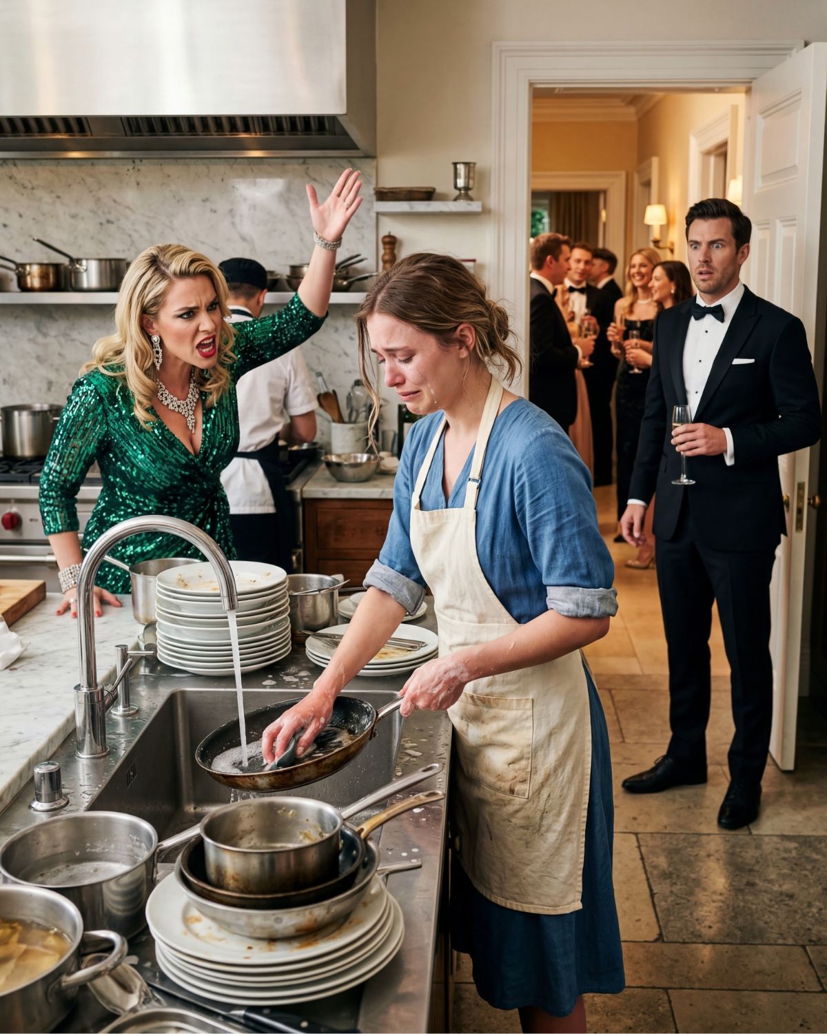 Cuando entré en silencio por la estrecha puerta que conectaba el pasillo con aquella pequeña cocina de servicio, esperaba encontrar a una empleada terminando de lavar los platos después de lo que parecía haber sido una reunión en el piso de arriba. En cambio, la imagen que me recibió me dejó clavado en el sitio tan de golpe que mi mano se quedó inmóvil sobre el marco de la puerta.
