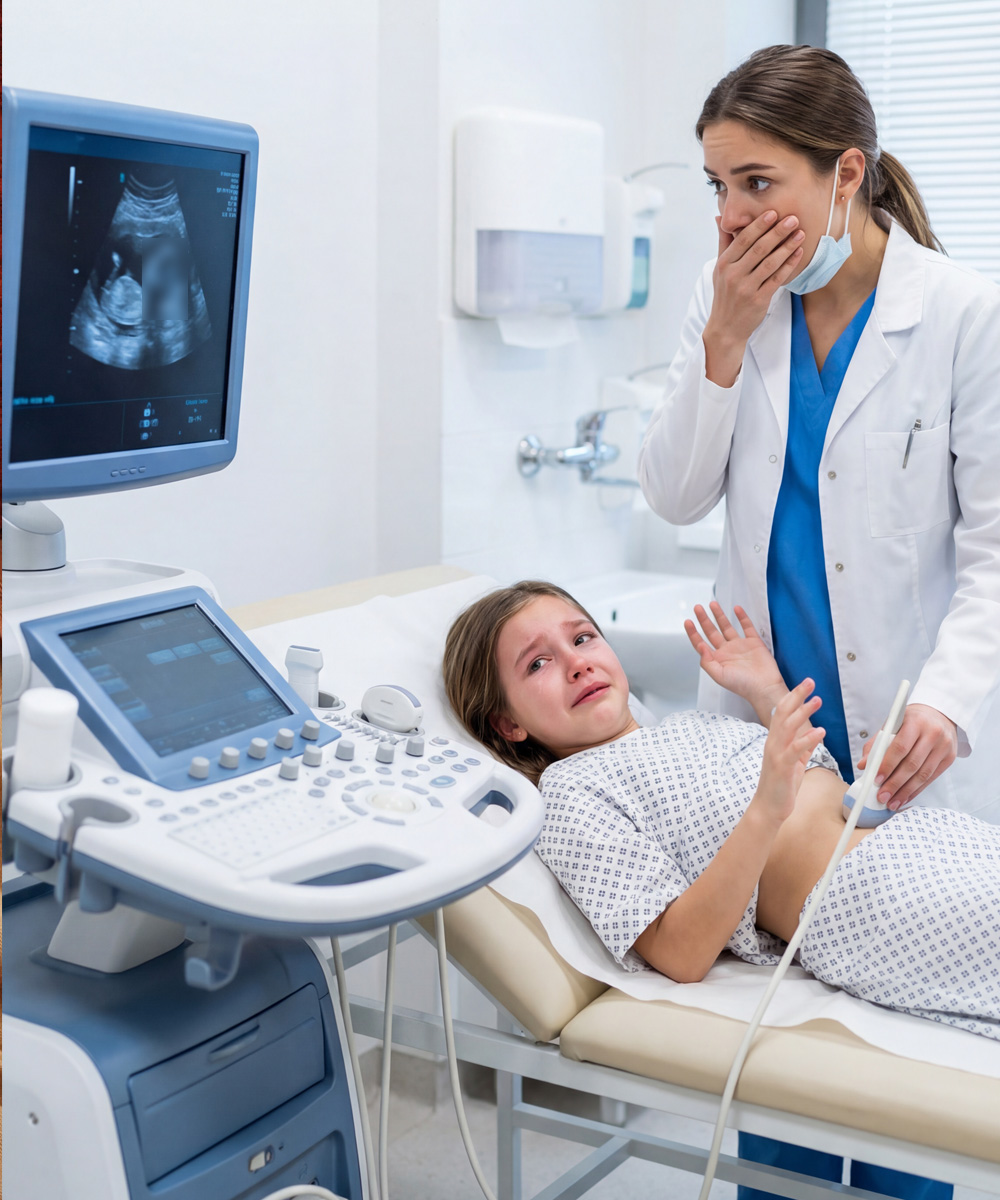 Una niña se queja de dolor de estómago después de un fin de semana en casa de su padrastro. El médico revisa la ecografía y llama inmediatamente a una ambulancia…